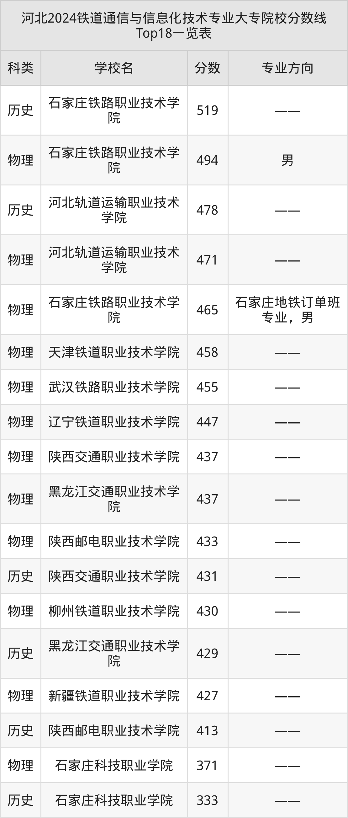 物理类最低收分范围在371分~494分之间,其中最低分院校是石家庄科技职业学院,最高分院校是石家庄铁路职业技术学院。结合上述分析,历史类考生比物理类考生更容易上铁道通信与信息化技术大专院校。