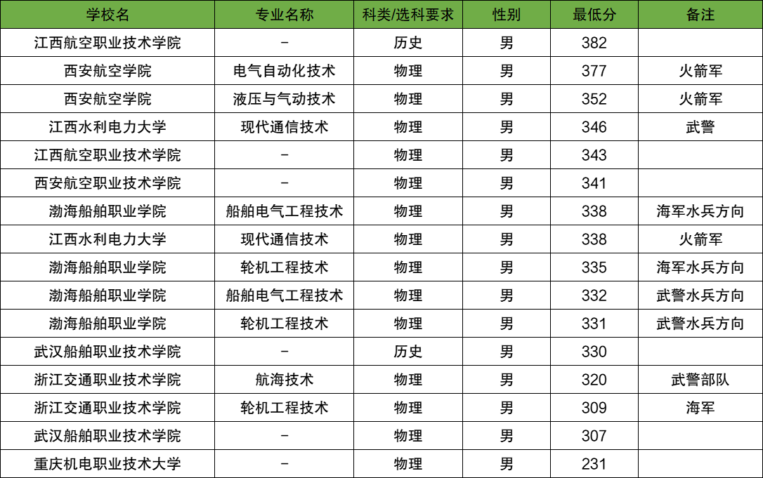 根据2025年吉林招录数据,考生分数至少要在专科线上71分,即231分以上才有可能会被录取,且低分院校有重庆机电职业技术大学、武汉船舶职业技术学院等。