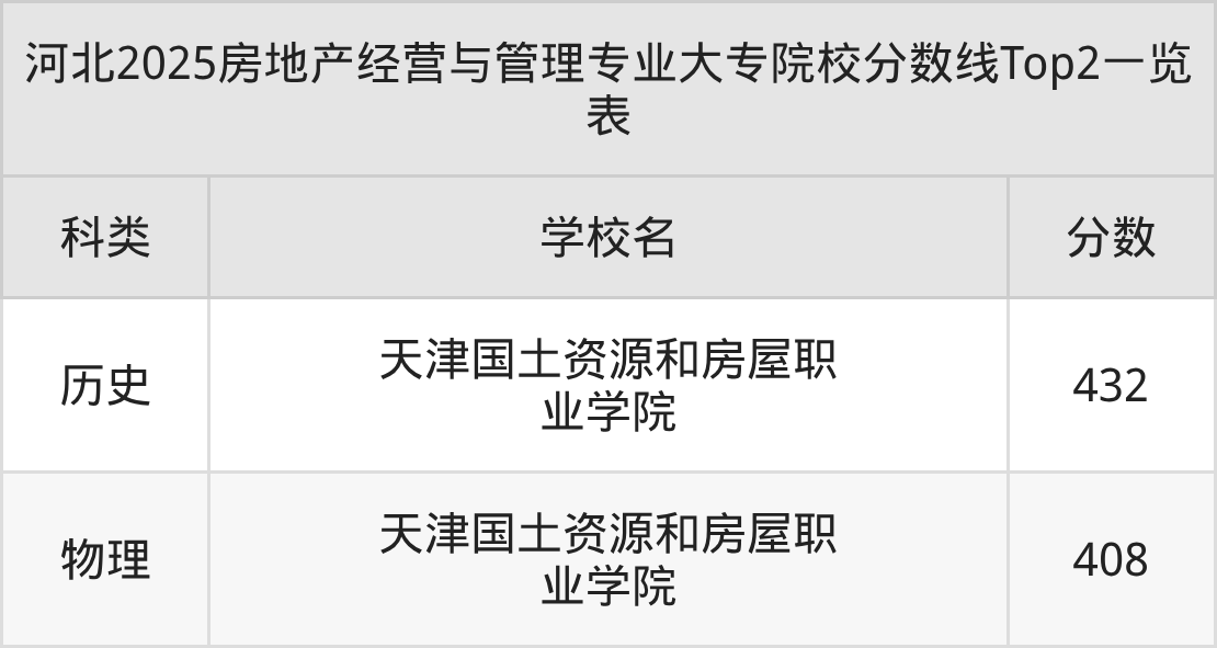 全国大专院校房地产经营与管理专业历史类最低收分为432分,对应的招生院校是天津国土资源和房屋职业学院。