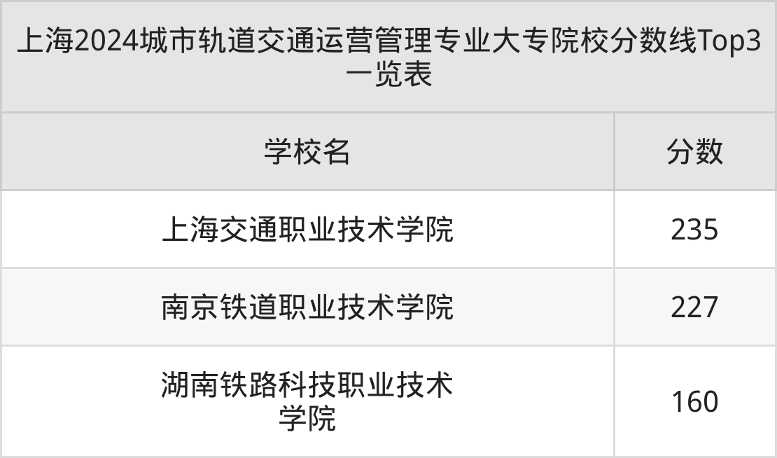 全国大专院校城市轨道交通运营管理专业最低收分范围在160分~235分之间,考生最容易被录取的是湖南铁路科技职业技术学院,分数门槛在本科线上160分。最难被录取的是上海交通职业技术学院,分数门槛在本科线上235分。