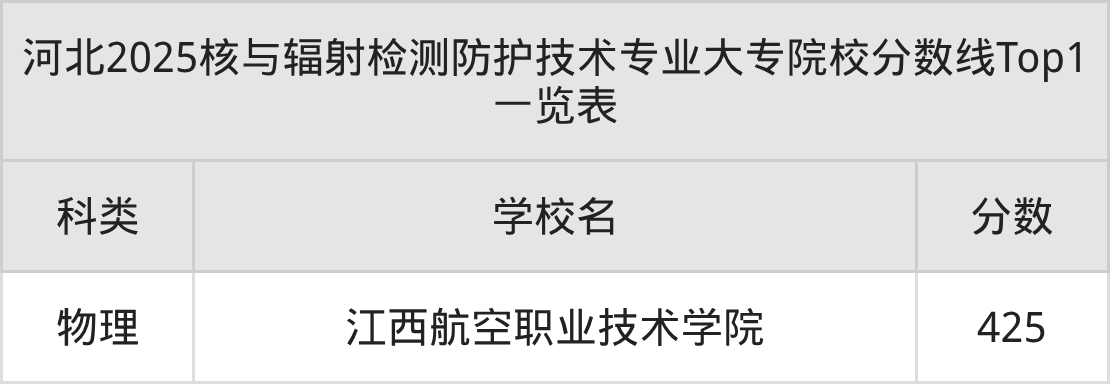 全国大专院校核与辐射检测防护技术专业物理类最低收分为425分,对应的招生院校是江西航空职业技术学院。