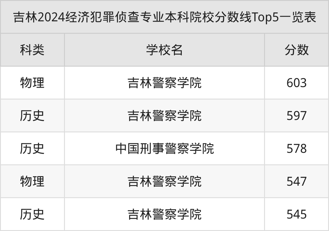 物理类最低收分范围在547分~603分之间,其中最低分院校是吉林警察学院,最高分院校是吉林警察学院。结合上述分析,历史类考生比物理类考生更容易上经济犯罪侦查本科院校。