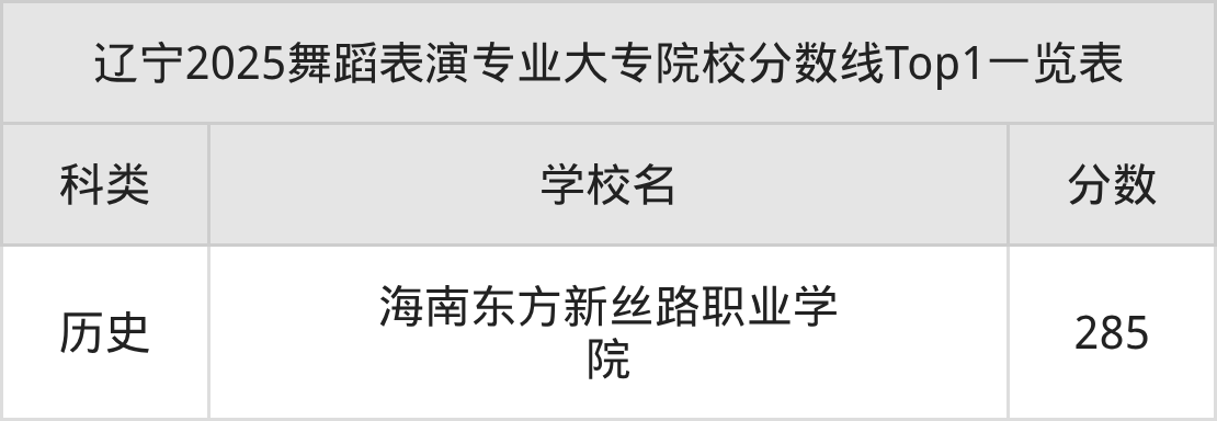 全国大专院校舞蹈表演专业历史类最低收分为285分,对应的招生院校是海南东方新丝路职业学院。