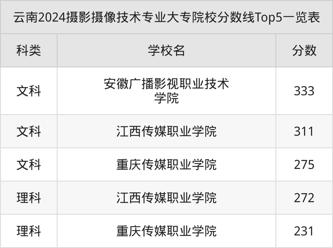 全国大专院校摄影摄像技术专业文科最低收分范围在275分~333分之间,考生最容易被录取的是重庆传媒职业学院,分数门槛在专科线上75分。最难被录取的是安徽广播影视职业技术学院,分数门槛在专科线上133分。