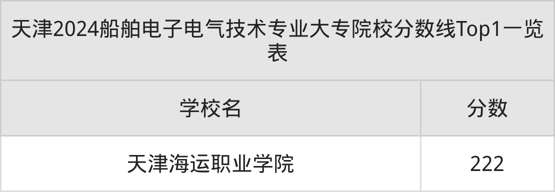 全国大专院校船舶电子电气技术专业最低收分为222分,对应的招生院校是天津海运职业学院。