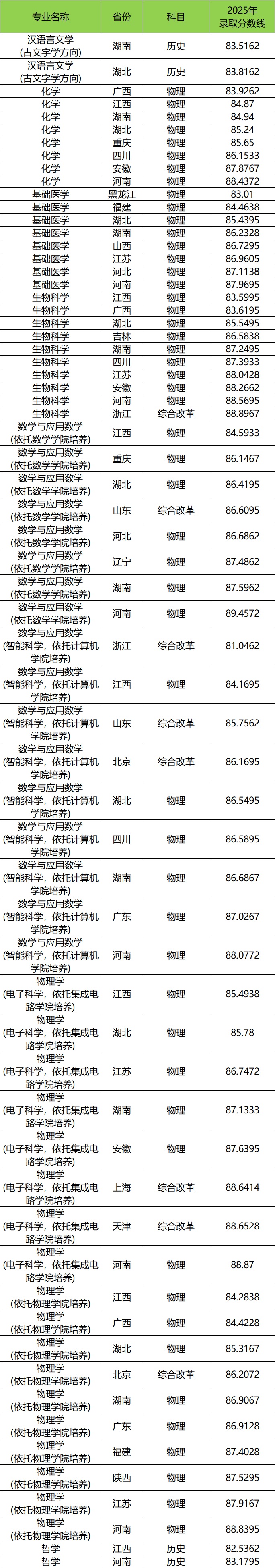 数学与应用数学(智能科学,依托计算机学院培养):浙江81.0462分、湖南86.6867分、广东87.0267分、河南88.0772分等;