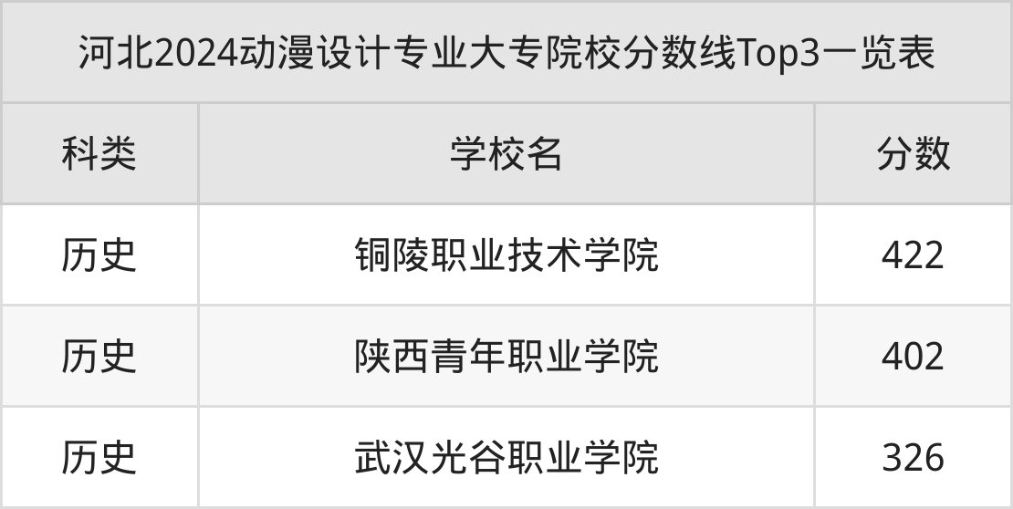 全国大专院校动漫设计专业历史类最低收分范围在326分~422分之间,考生最容易被录取的是武汉光谷职业学院,分数门槛在专科线上126分。最难被录取的是铜陵职业技术学院,分数门槛在专科线上222分。