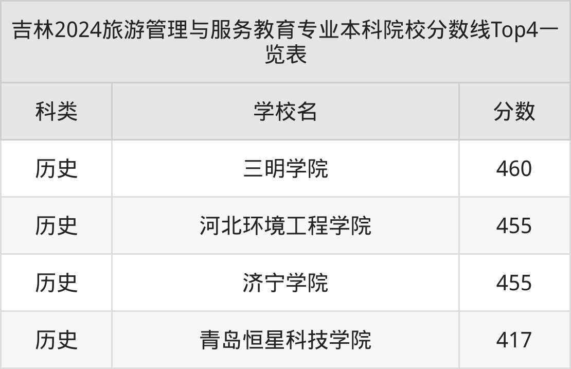 全国本科院校旅游管理与服务教育专业历史类最低收分范围在417分~460分之间,考生最容易被录取的是青岛恒星科技学院,分数门槛在本科线上48分。最难被录取的是三明学院,分数门槛在本科线上91分。