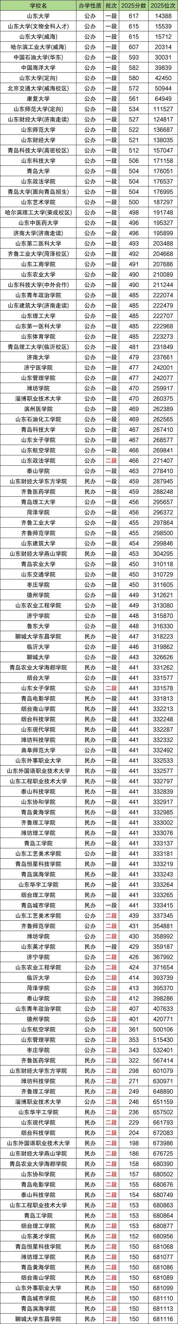 下表为大家展示了2025年山东所有本科大学名单及录取分数线,可查看。更多地区分数线数据可在文章下方输入分数查看: