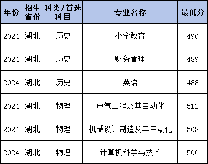 2024年湖北理工学院地方专项计划在湖北录取最低分历史类为488分、物理类为506分,历史组收分最低的专业为英语、物理组收分最低的专业为计算机科学与技术。