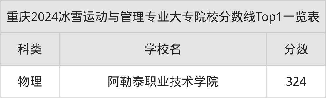 全国大专院校冰雪运动与管理专业物理类最低收分为324分,对应的招生院校是阿勒泰职业技术学院。