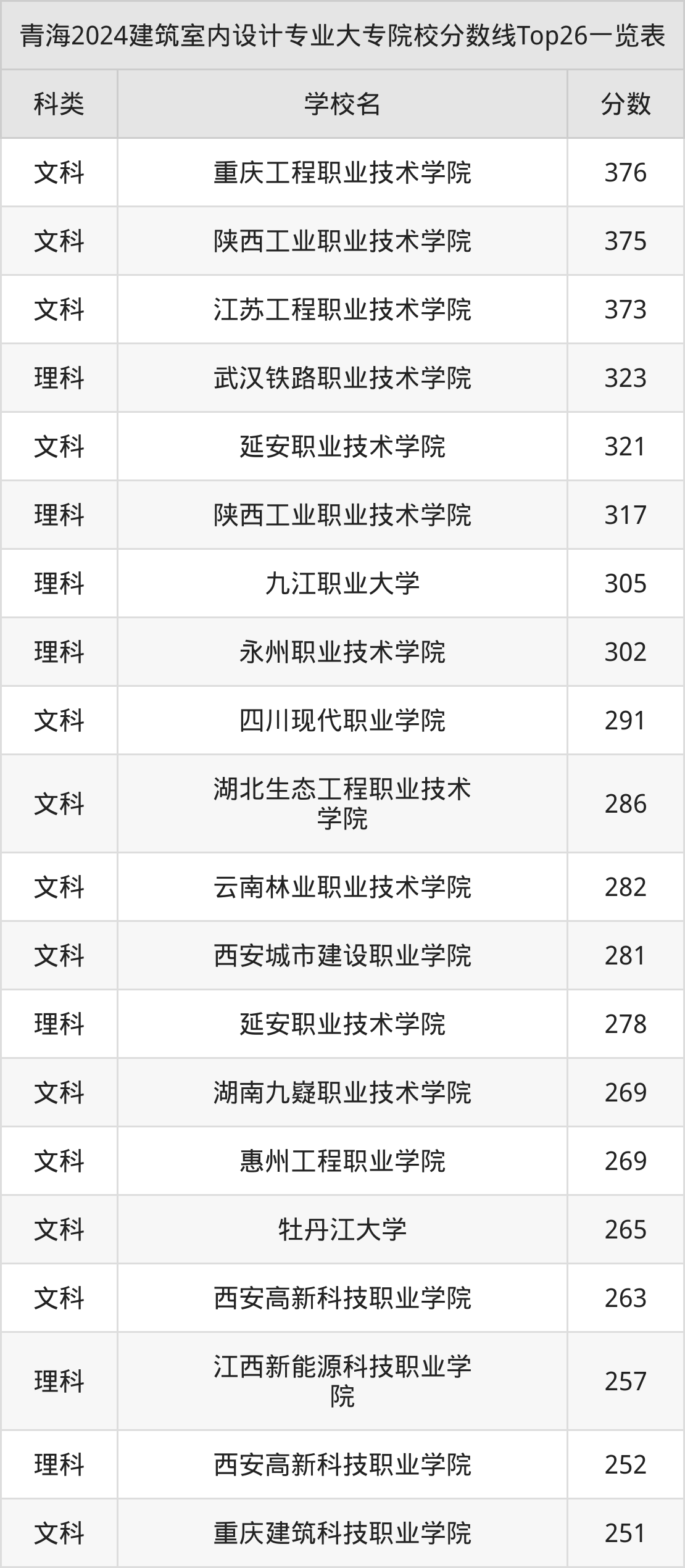 建筑室内设计专业大专院校实力排名靠前的有南宁职业技术学院、江西环境工程职业学院、广西建设职业技术学院等。2024年大专建筑室内设计专业招生最低分数为167分(文科),而想报考该专业的理科考生分数至少要在184分以上。