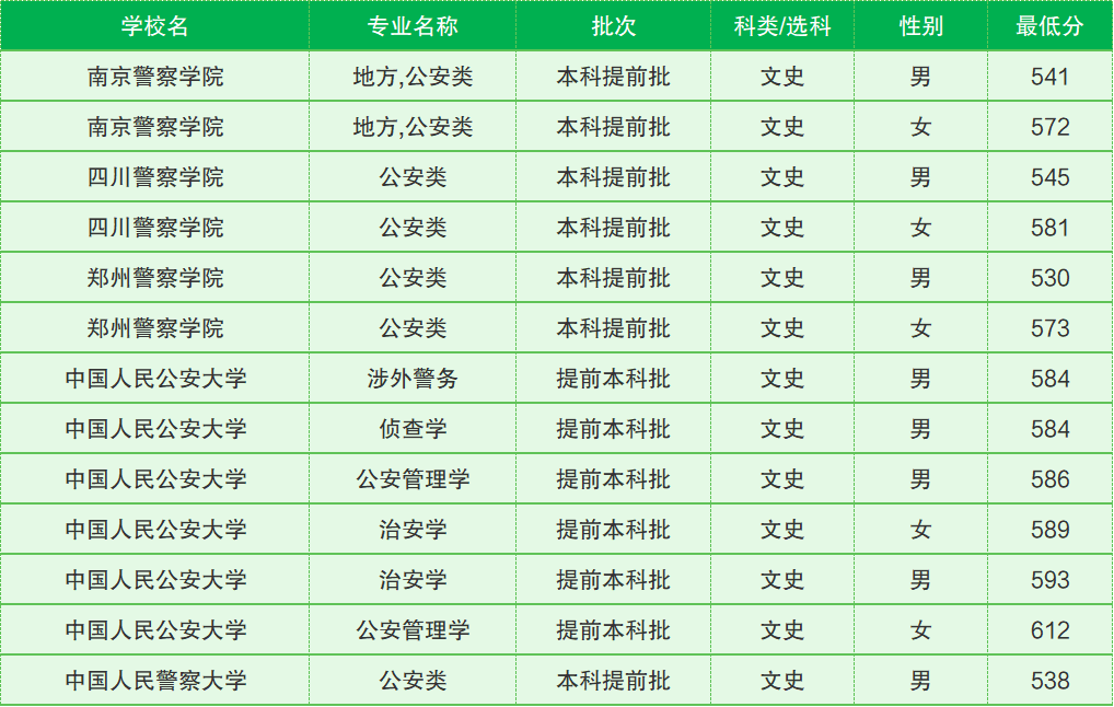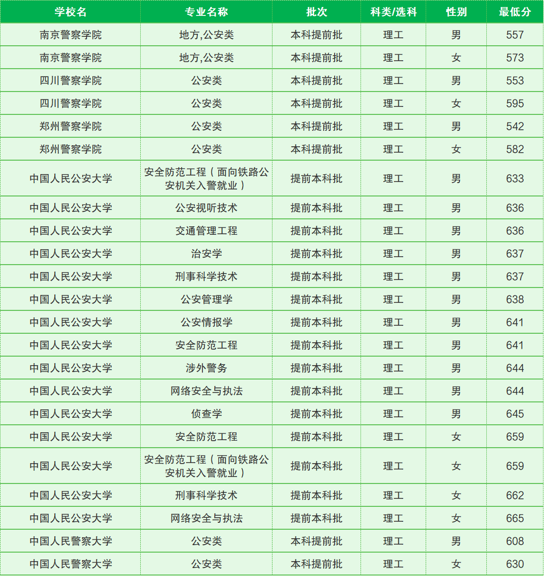 理科公安类专业招生院校中,省属警校的分数门槛会较低一些,分数范围在542分~595分之间,而部属院校分数基本在600分以上,其中女生专业最低分普遍比男生更高,如中国人民公安大学的女生分数均在650分以上。