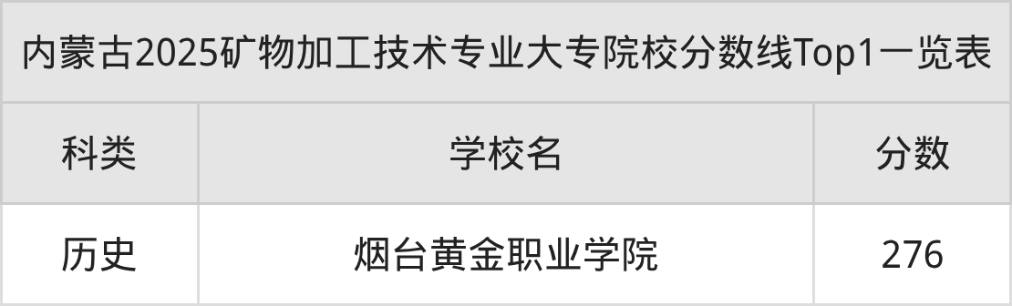 全国大专院校矿物加工技术专业历史类最低收分为276分,对应的招生院校是烟台黄金职业学院。