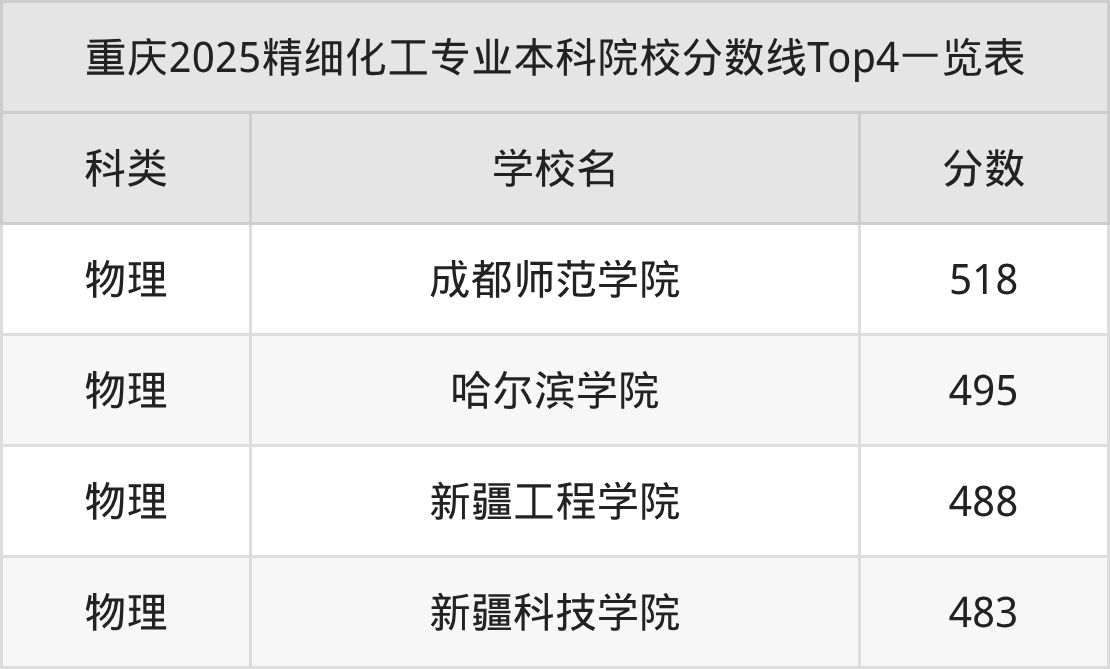 精细化工专业本科院校实力排名靠前的有天津大学、大连理工大学、华东理工大学等。2025年本科精细化工专业招生最低分数为483分(物理类)。