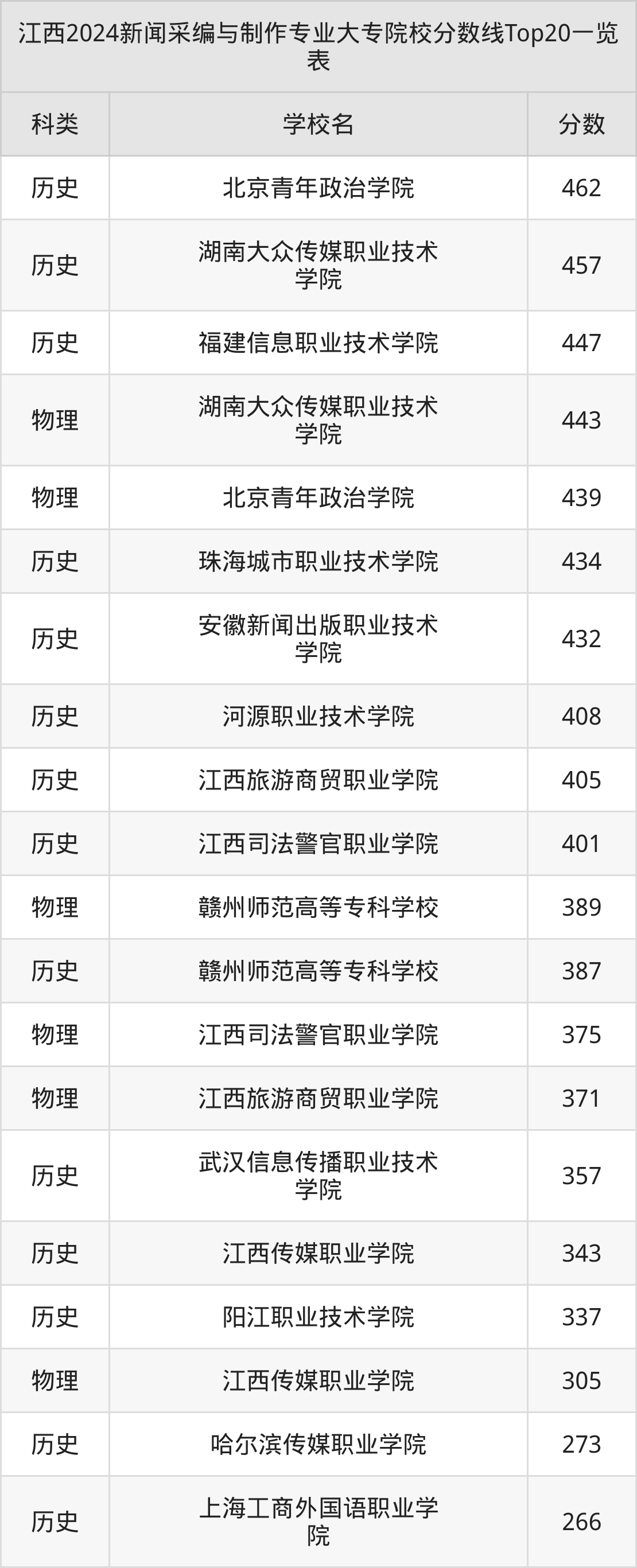 物理类最低收分范围在305分~443分之间,其中最低分院校是江西传媒职业学院,最高分院校是湖南大众传媒职业技术学院。结合上述分析,历史类考生比物理类考生更容易上新闻采编与制作大专院校。