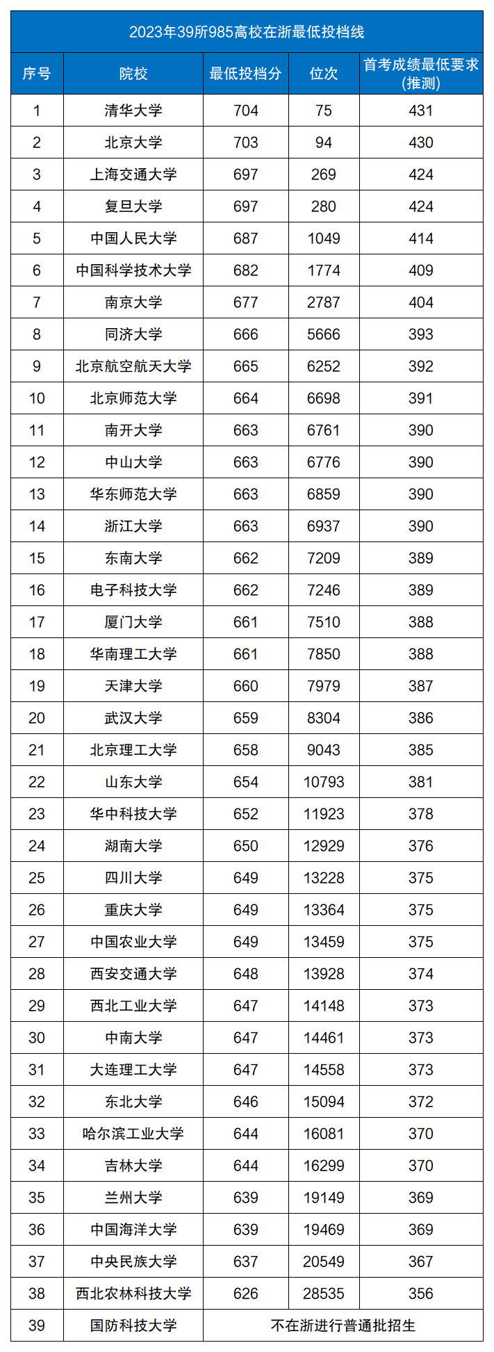 下图是2023年39所985高校在浙的最低投档线以及首考成绩推测表,同学们可滑动查看: