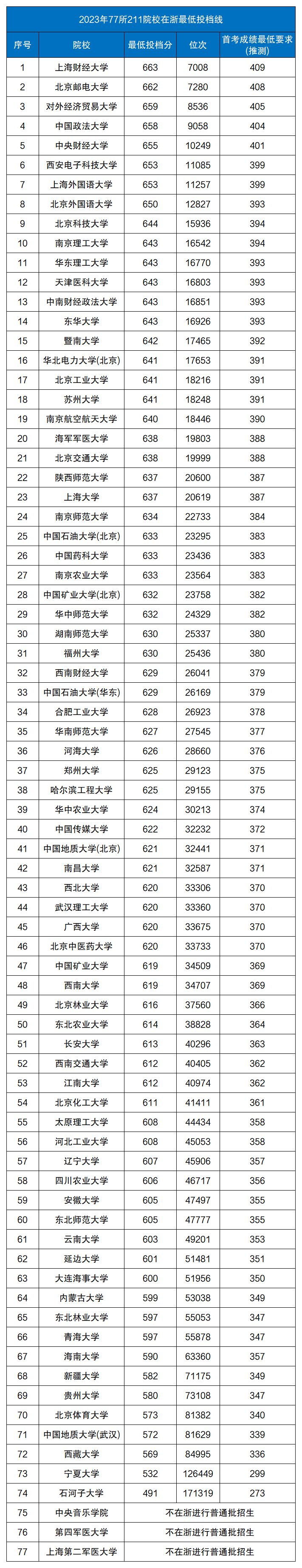 因为在浙招生的重点大学数量过多,这里就不具体展示各院校投档线和首考推测分数了,只给出最低分数参考: