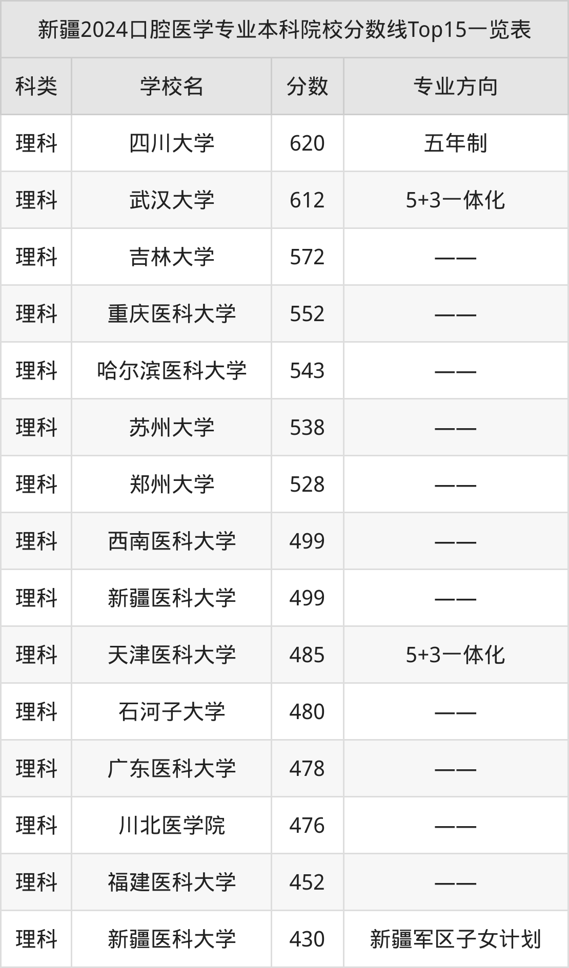上述院校为有排名的院校,下面根据2024年口腔医学专业本科招生计划表,列举全部招生院校名单(不同省份招生院校名单及数量有差异,这里以新疆高考为例):