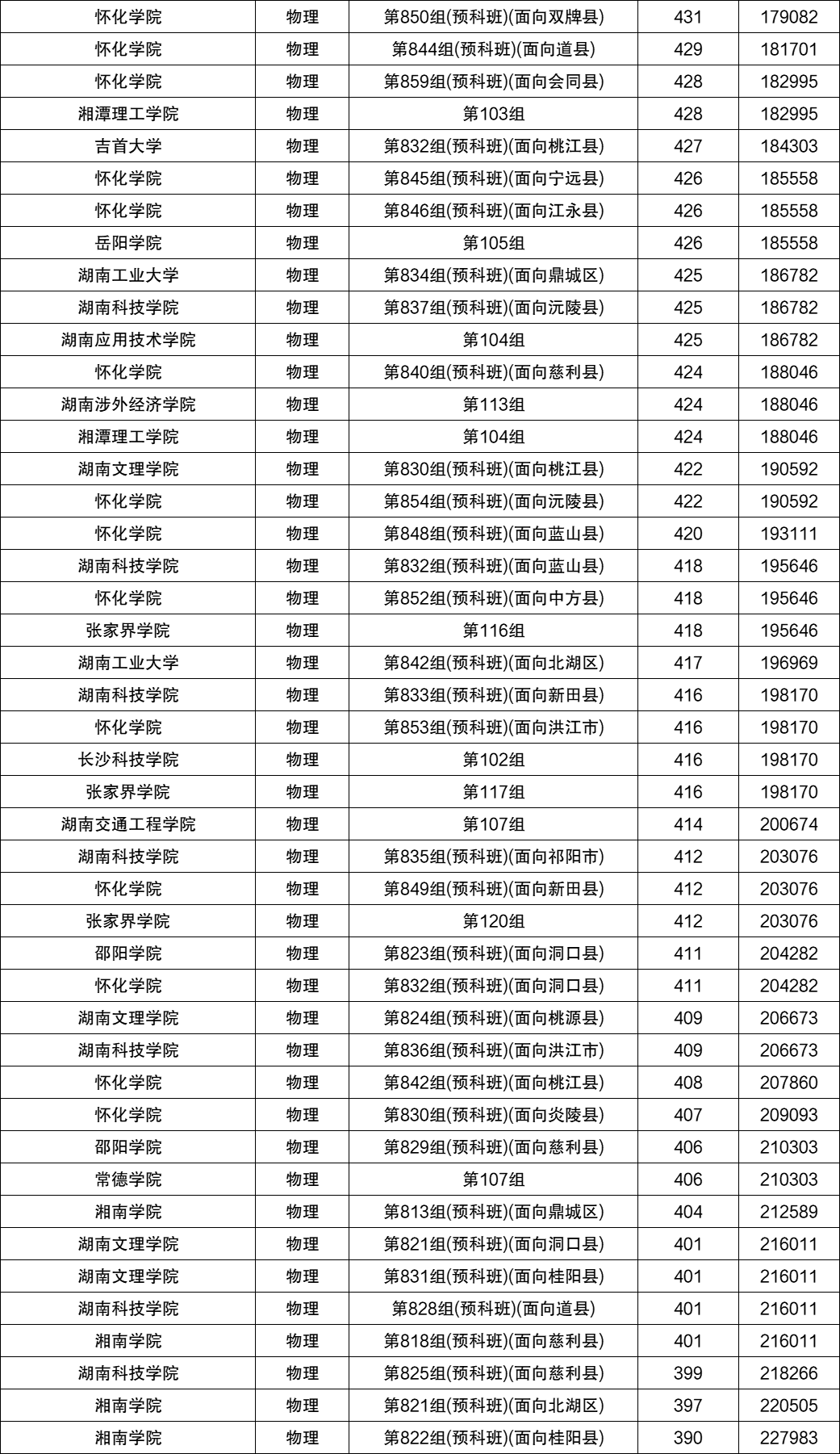 以物理类为例,分数最低的大学是湘南学院(第822组,预科班,面向桂阳县),最低位次为227983名,2026届本科线附近的考生可考虑报考。