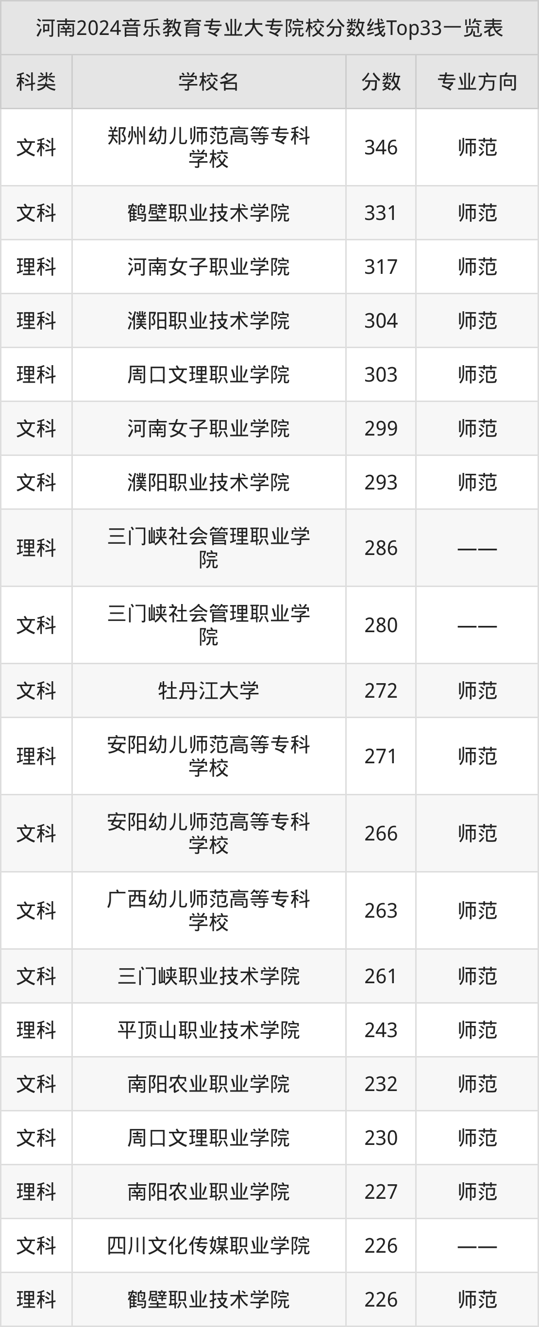 理科最低收分范围在185分~317分之间,其中最低分院校是河南质量工程职业学院,最高分院校是河南女子职业学院。文科、理科考生上音乐教育大专院校的难度是一样的。