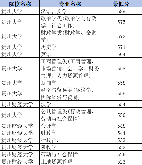 2024年地方专项计划各大学在贵州历史类分数线最低、最易考的一所院校及专业为:贵州财经大学税收学(532分)、贵州财经大学劳动与社会保障(526分)、贵州财经大学土地资源管理(523分)。