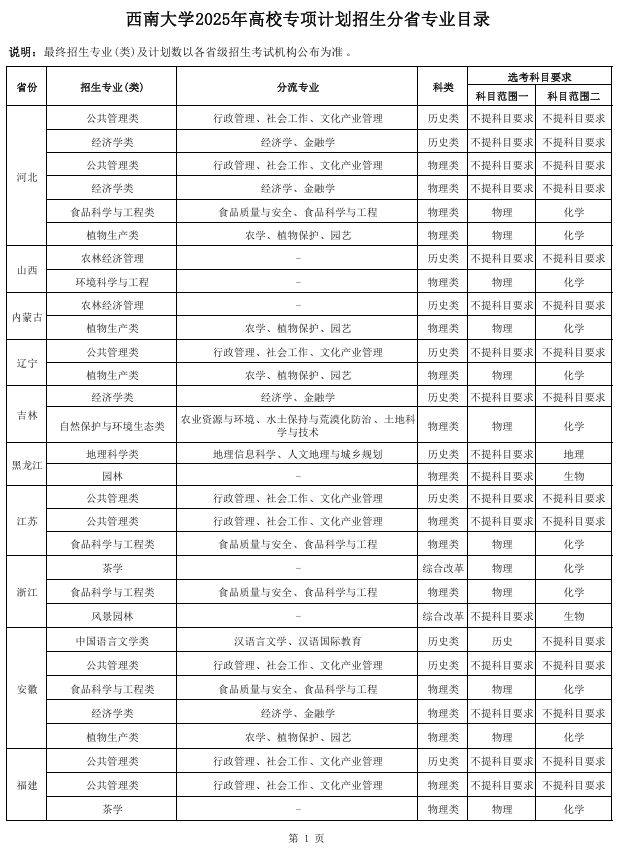 2025年西南大学高校专项计划招生专业覆盖文科、理科、工科三大领域,共开放210个名额,包括: