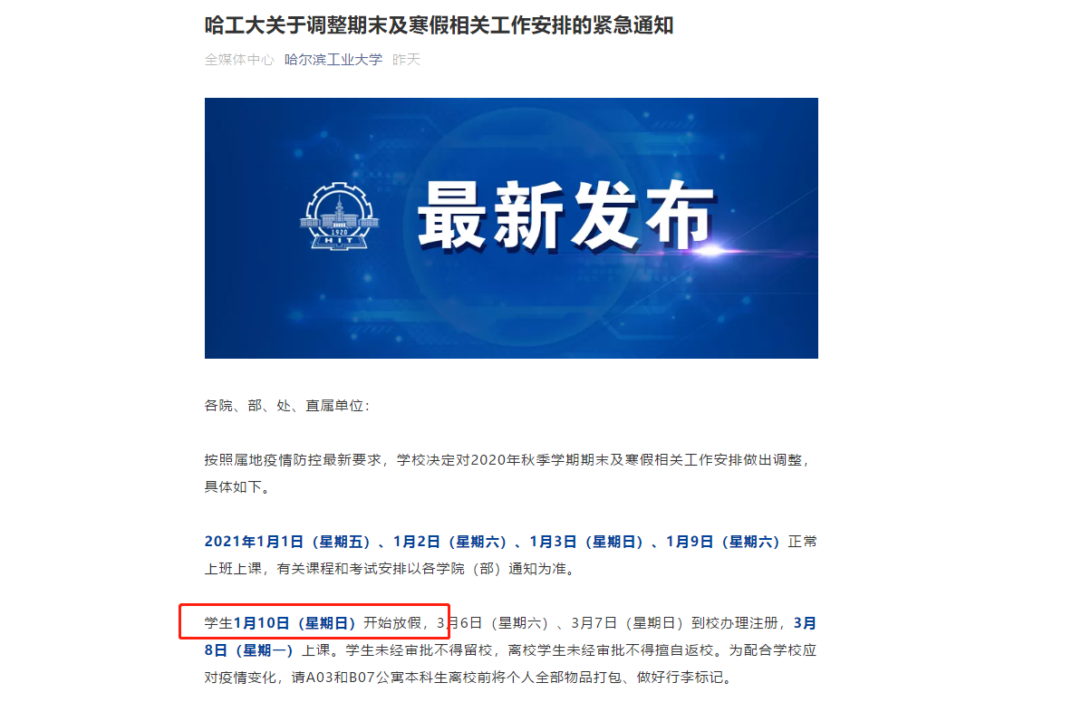 2、哈尔滨工业大学:2021年1月1日-3日正常上班上课,学生寒假从1月10日开始放,3月6日、3月7日返校。通知还规定,为防控疫情,全校将于2020年12月29日开始实行封闭式管理,学生出入校园须经过审批。