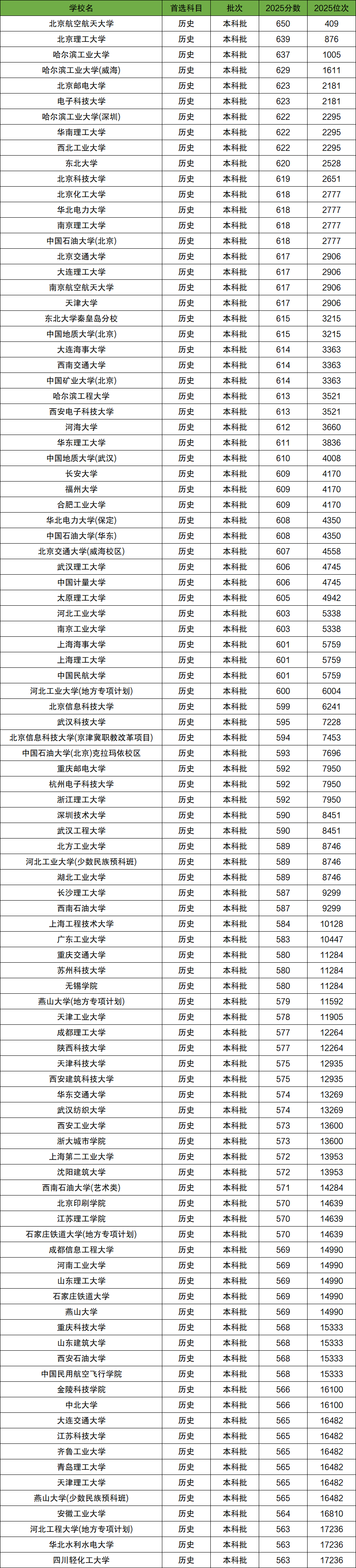 2025年全国理工大学在河北历史类录取分数线排名前100名一览表: