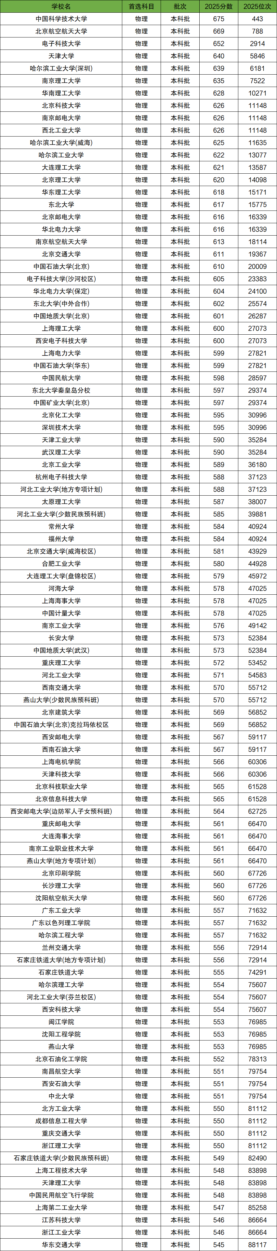 2025年全国理工大学在河北物理类录取分数线排名前100名一览表: