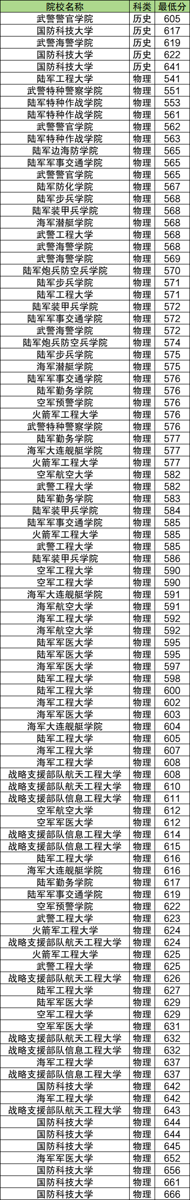因为在提前批招生院校较多,受到篇幅限制,本文就以军校、警校和定向士官为例,整理出这三类院校在安徽提前批的录取分数线。