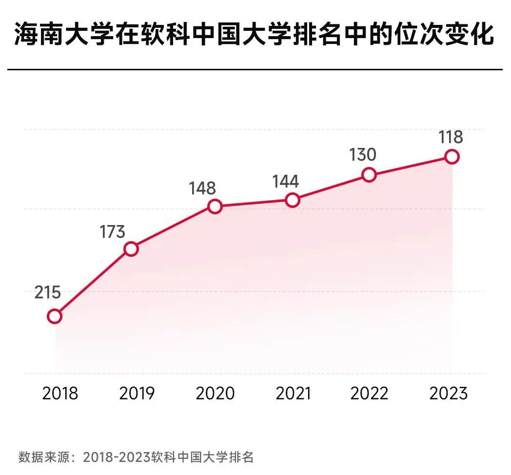 这些年,海南大学不断发展,在软科中国大学排名中的位次不断上涨,从2018年的排名215位到2023年的排名118位。