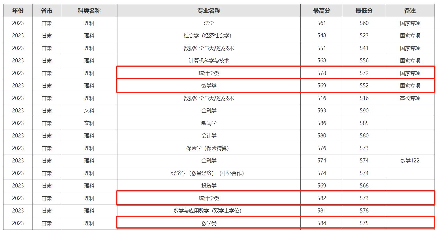 (2)有降分录取的情况,降分情况视不同情况而定。比如下图为上财2023年同一专业在普通批和通过国家专项计划录取的分数对比。其中数学类在甘肃通过国家专项计划招生的理科最低分比普通批低了23分,而统计学类仅低了1分。