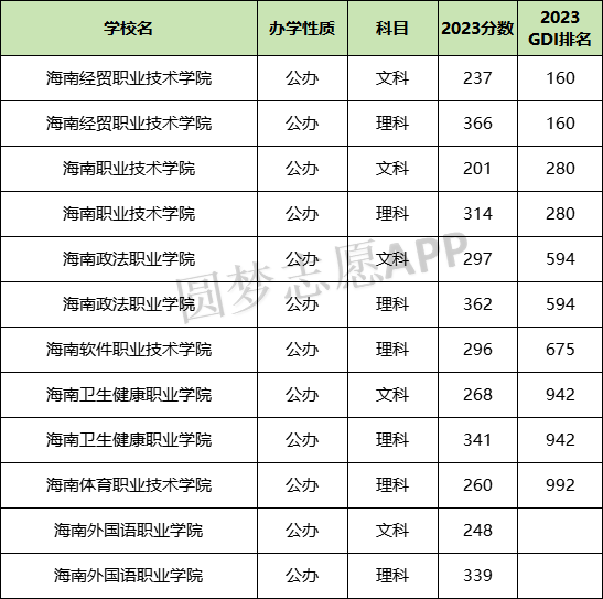 下表为2023年海南省各公办专科院校的排名和录取分数,各位可以在圆梦志愿app测评被海南各大学的录取概率。