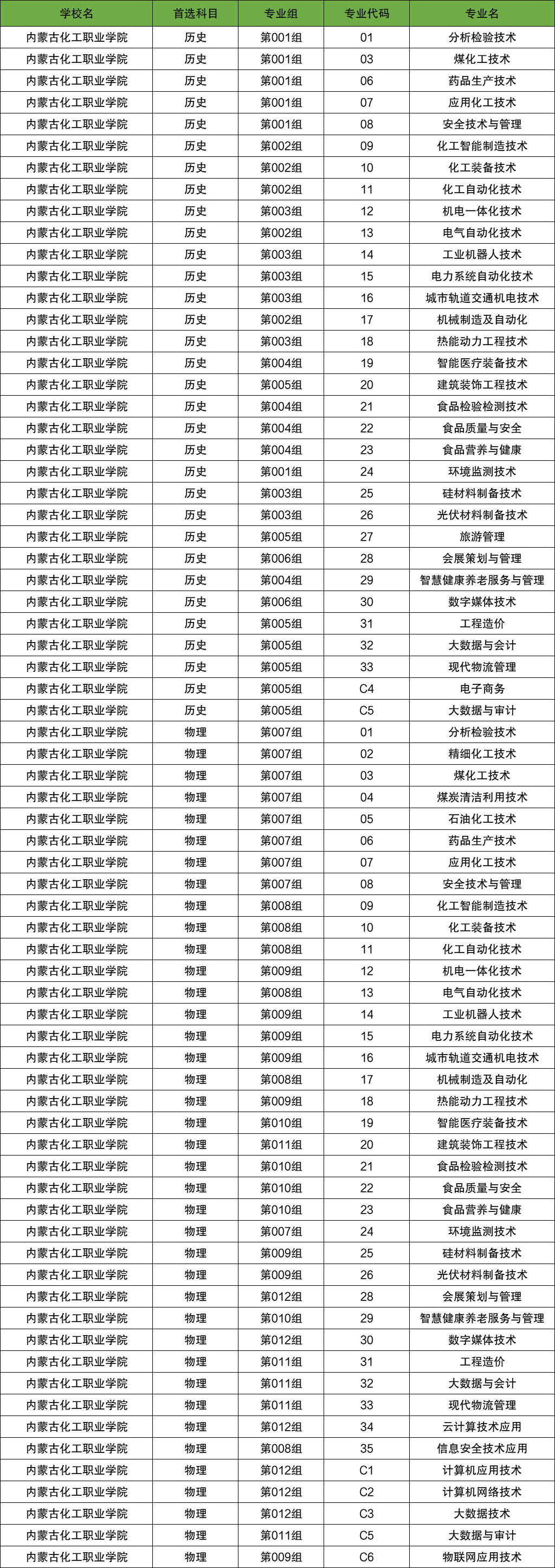 内蒙古化工职业学院志愿填报专业代码一览表: