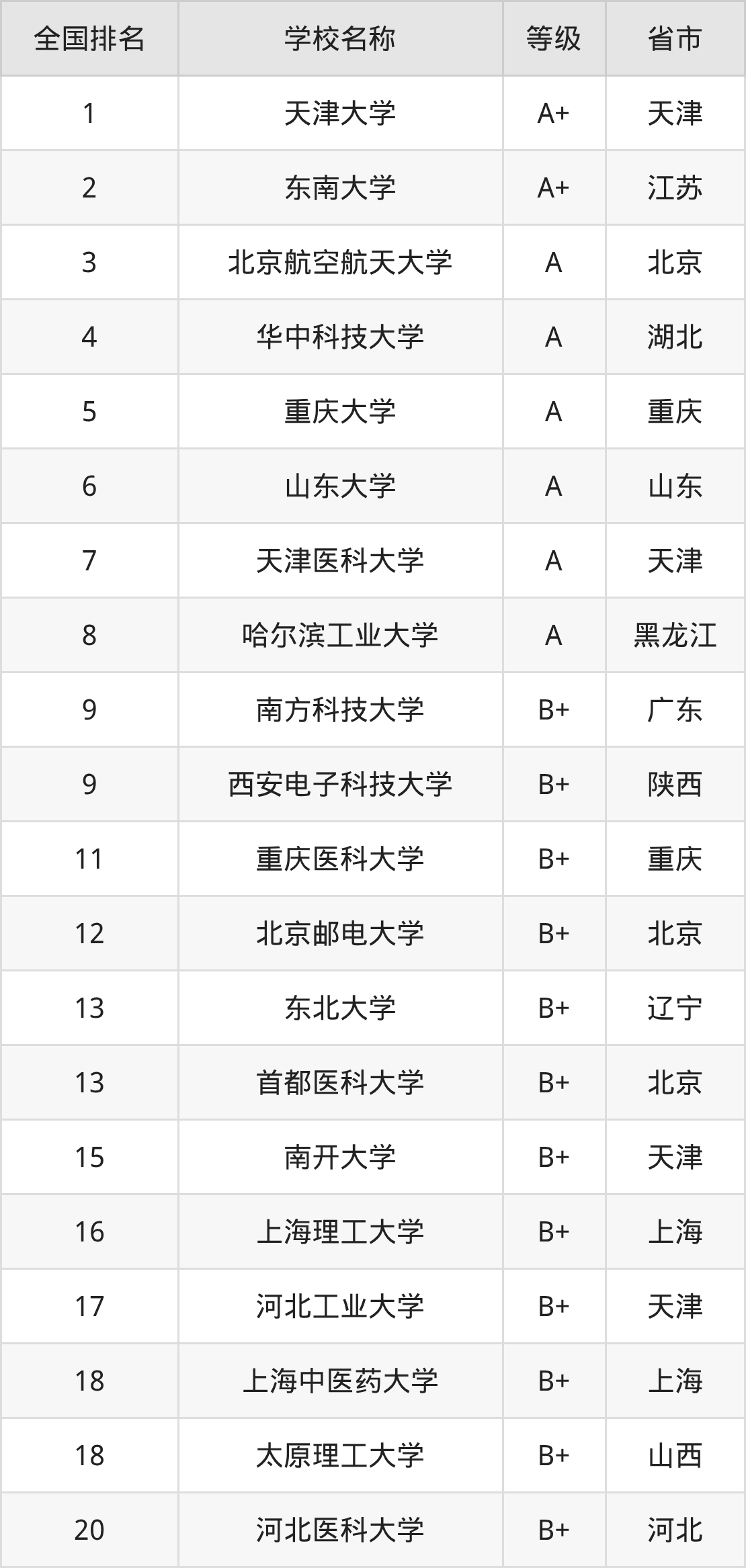 下面是智能医学工程专业全国排名前10的大学名单及实力评级: