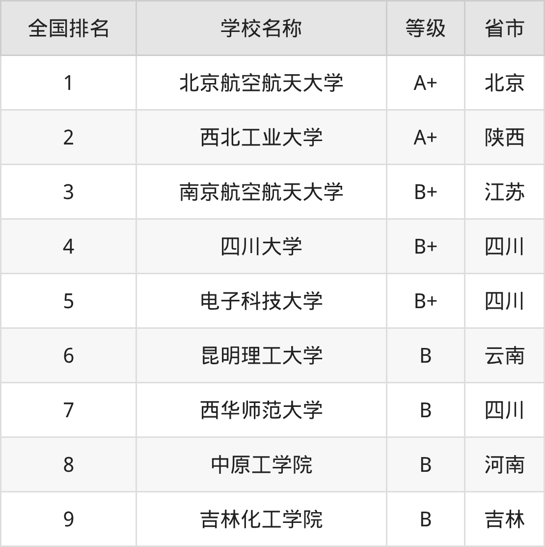 全国飞行器控制与信息工程开设院校参与排名的共有9所,实力最强的是北京航空航天大学(全国排名第1名),其专业实力等级被评为A+级。