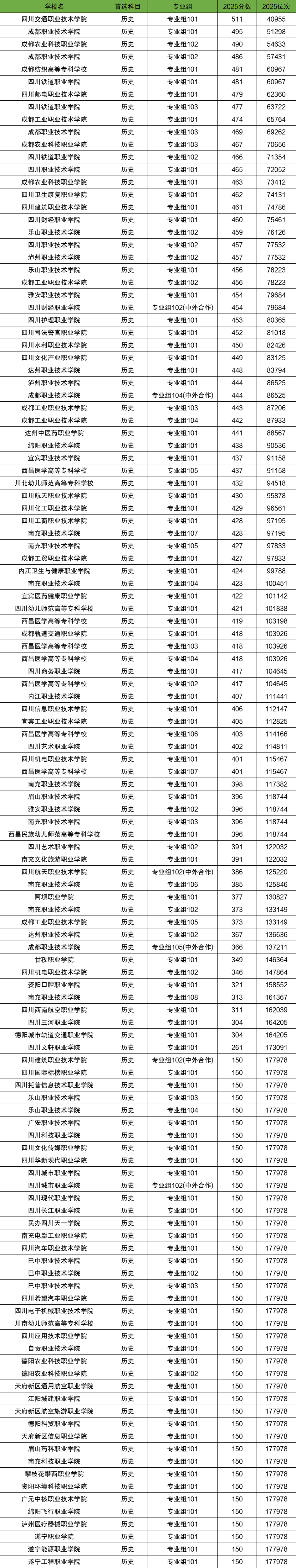1、四川历史类(专科大学最低录取分数线150分)