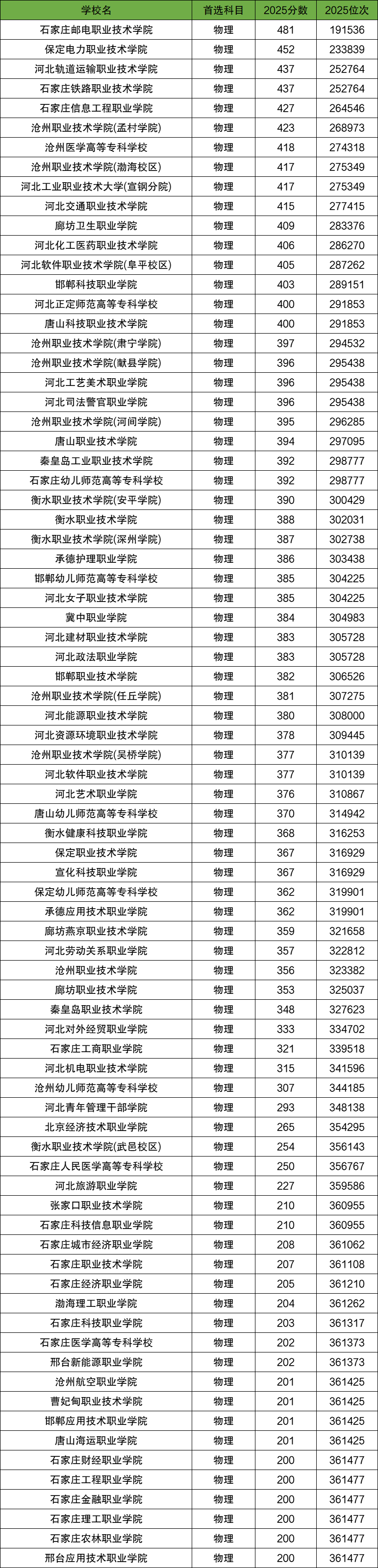 4、河北物理组(专科大学最低录取分数线200分)