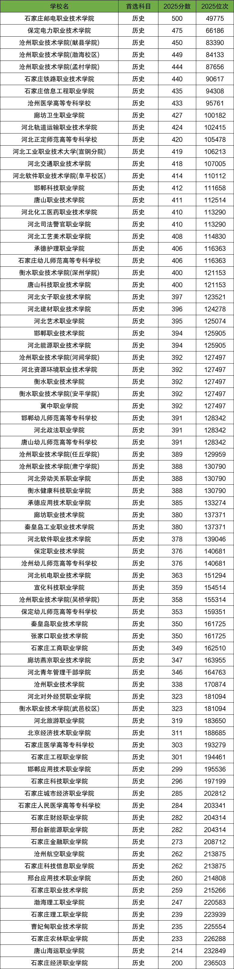 3、河北历史组(专科大学最低录取分数线200分)
