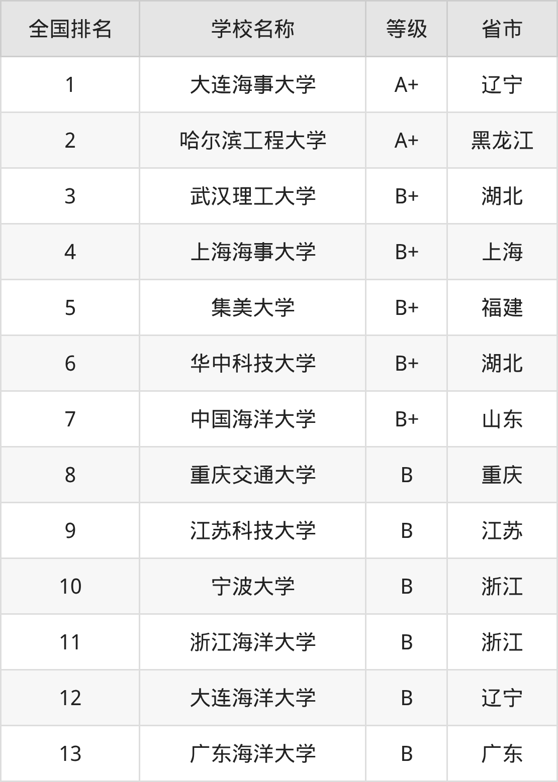 全国轮机工程开设院校参与排名的共有13所,实力最强的是大连海事大学(全国排名第1名),其专业实力等级被评为A+级。