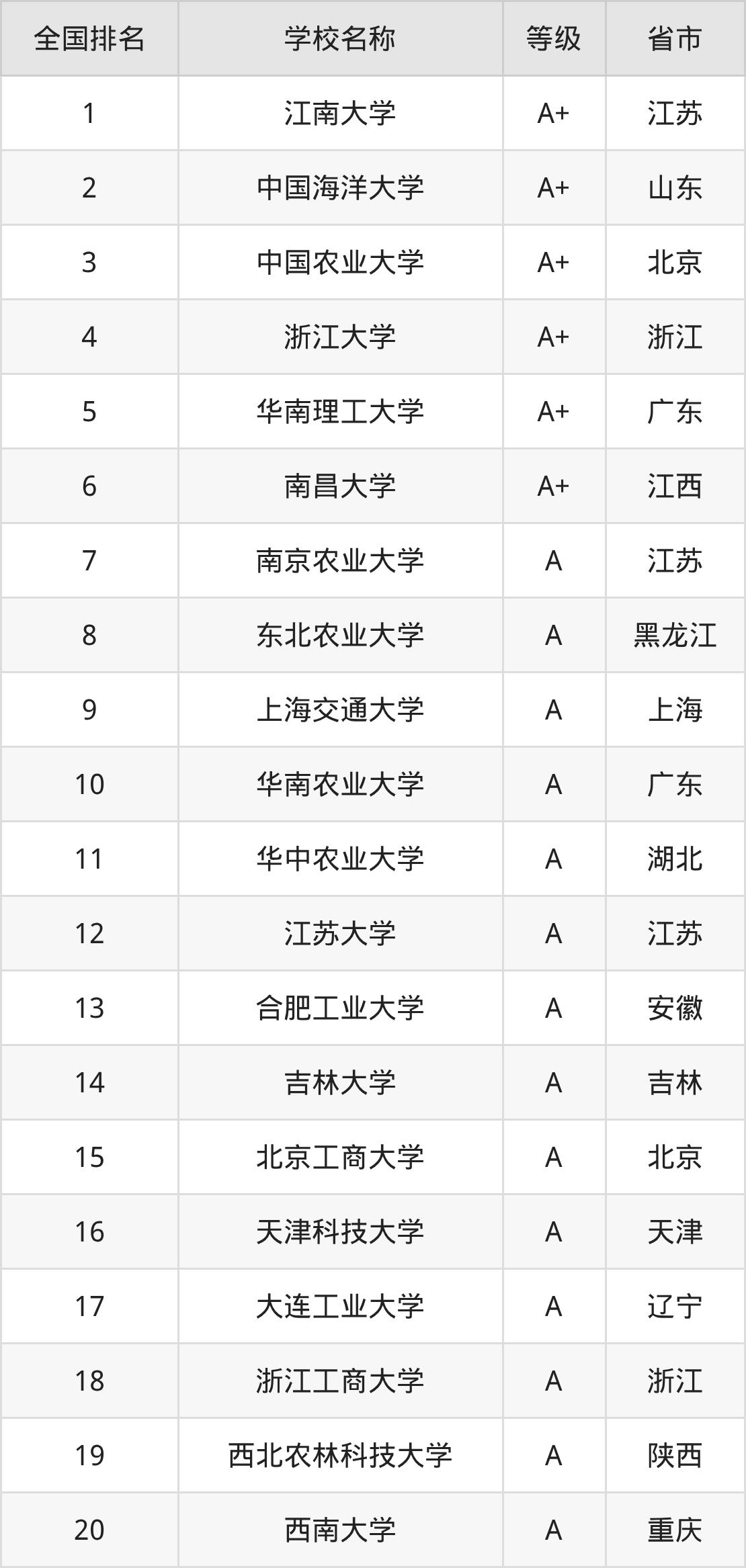 1、江南大学(A+级)