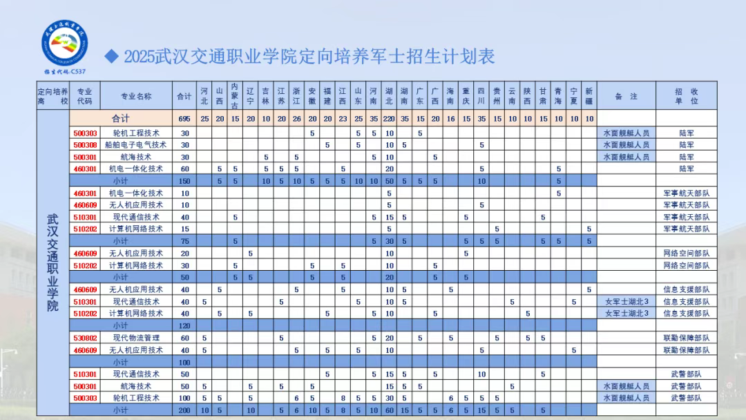 以下为2025年武汉交通职业学院定向培养军士招生简章中的重要信息,供各位想要报考武汉交通职业学院的同学参考。