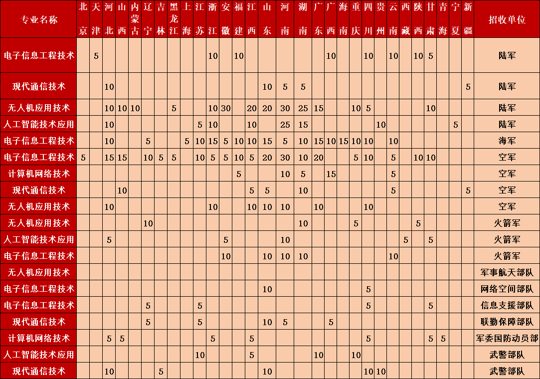 共有现代通信技术、计算机网络技术、无人机应用技术、机电一体化技术、轮机工程技术、航海技术、船舶电子电气技术和现代物流管理等8个定向军士培养专业。