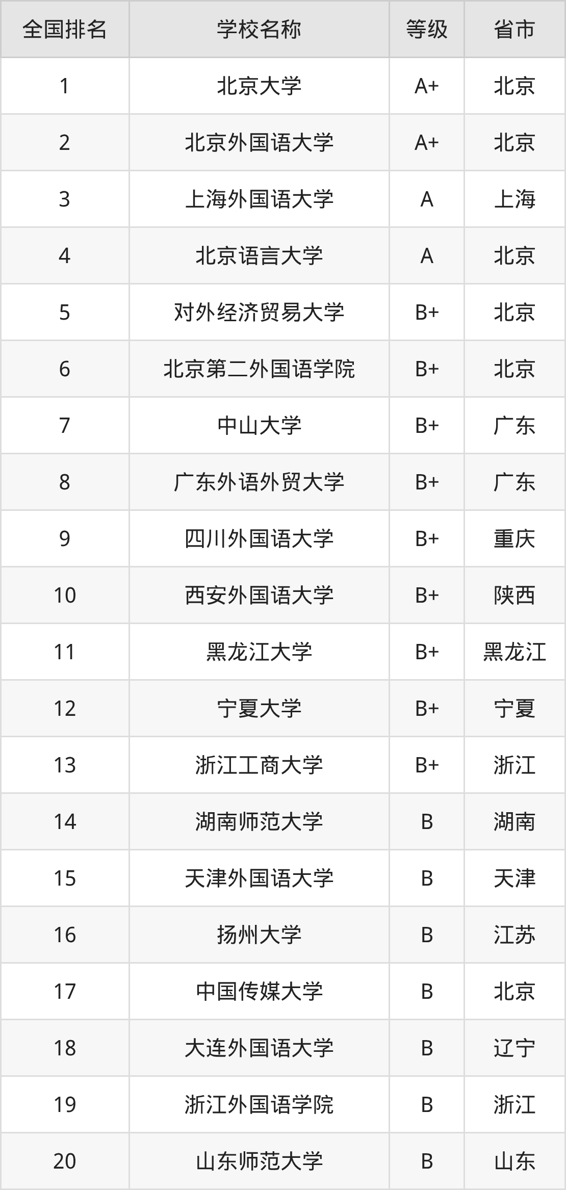 全国阿拉伯语开设院校参与排名的共有22所,实力最强的是北京大学(全国排名第1名),其专业实力等级被评为A+级。