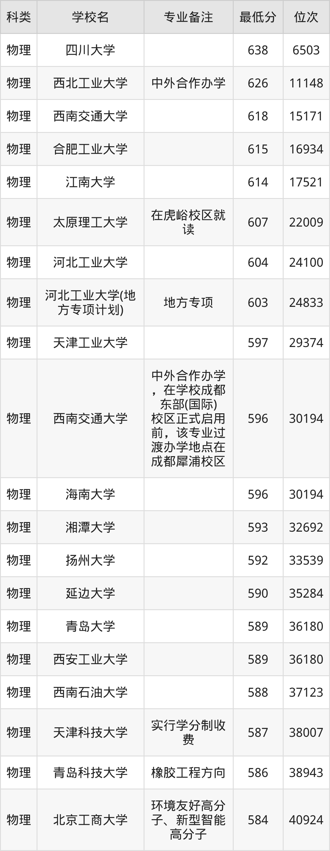 2025年全国大学高分子材料与工程录取分数线在494分~638分之间。数据显示,考生如果想报考公办大学,分数要在499分及以上,最低分院校有昌吉学院等。