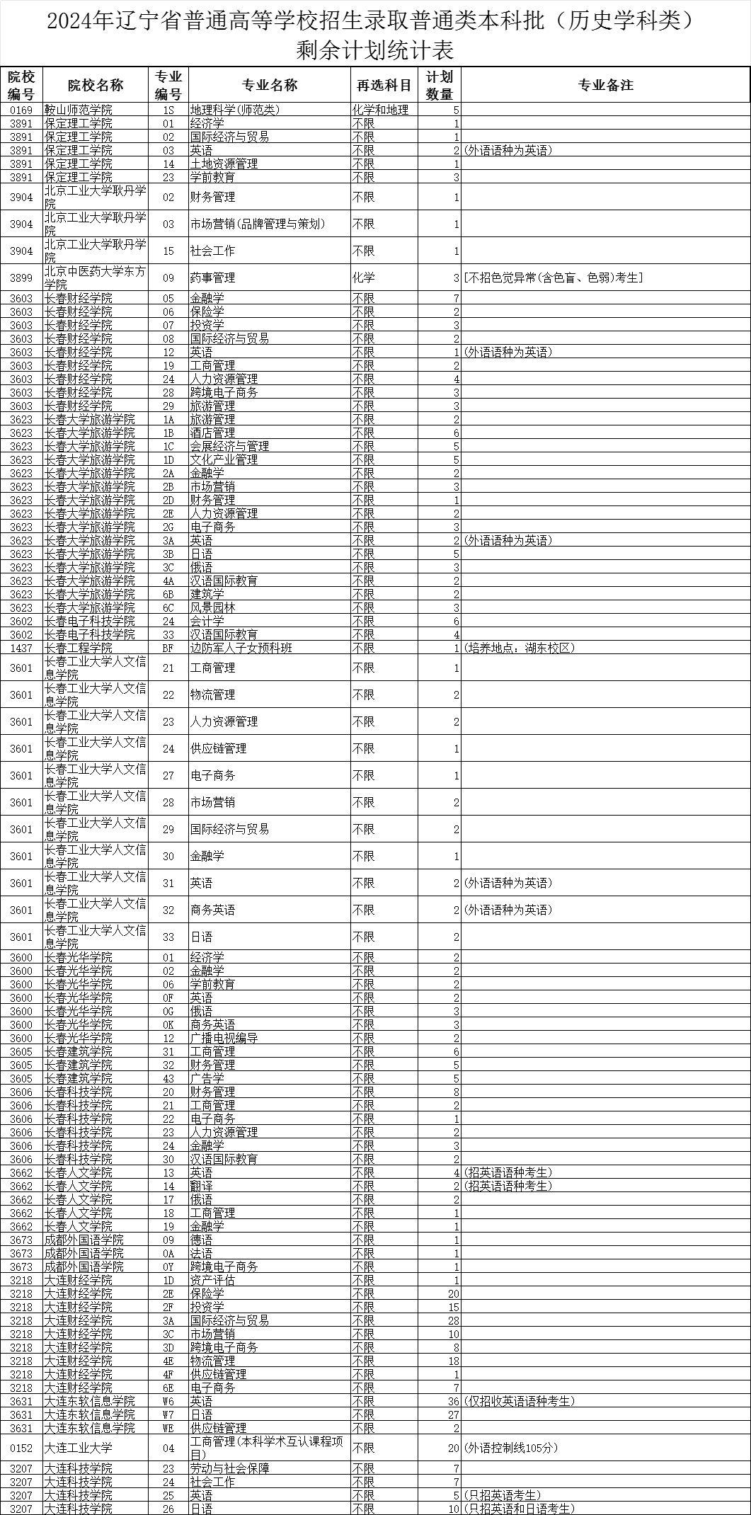1、2024年辽宁省普通高等学校招生录取普通类本科批(历史学科类)剩余计划统计表(点击链接下载查看)