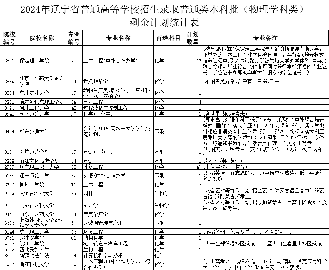 2、2024年辽宁省普通高等学校招生录取普通类本科批(物理学科类)剩余计划统计表(点击链接下载查看)