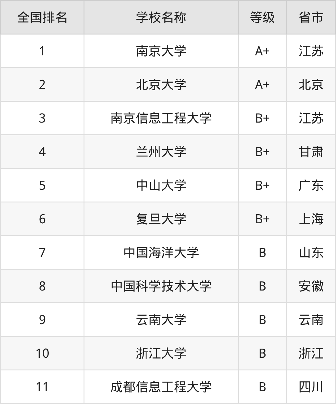 全国大气科学开设院校参与排名的共有11所,实力最强的是南京大学(全国排名第1名),其专业实力等级被评为A+级。