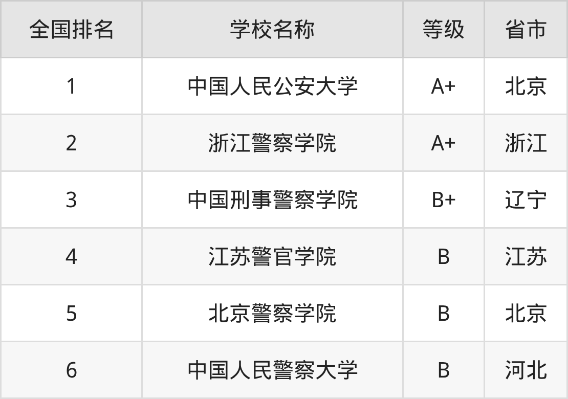 全国涉外警务开设院校参与排名的共有6所,实力最强的是中国人民公安大学(全国排名第1名),其专业实力等级被评为A+级。